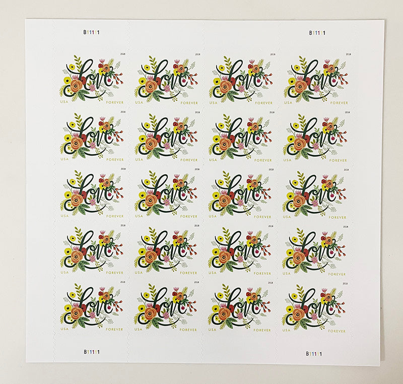 The Love Flourishes stamp combines a heartfelt hand-lettered "Love" with an elegant floral design, exuding romance and sophistication.